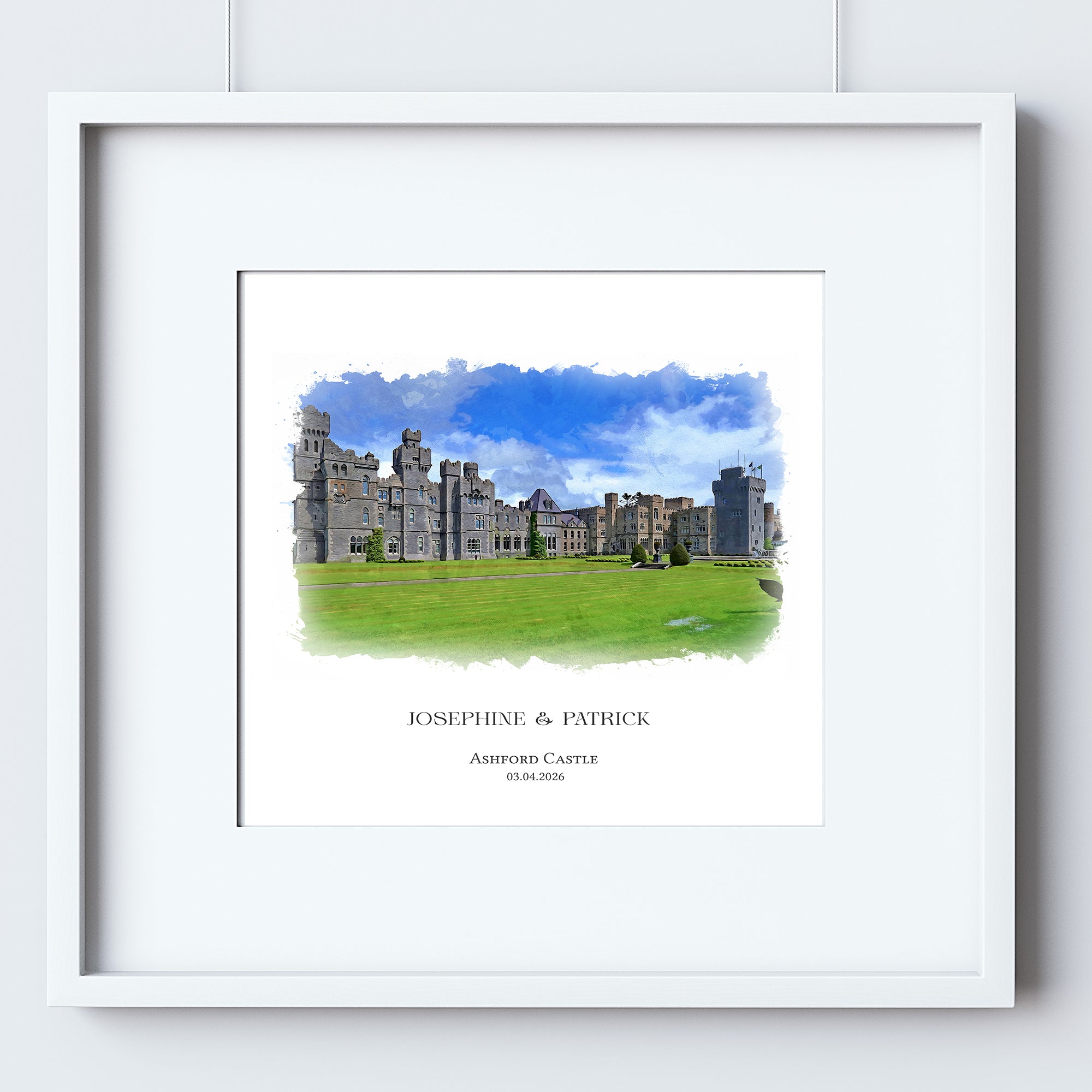 One high definition 300 dpi printable JPG file(s) sized to your specification with the Watercolour Design of the Wedding Venue and your requested First Name, Venue and Wedding Date.