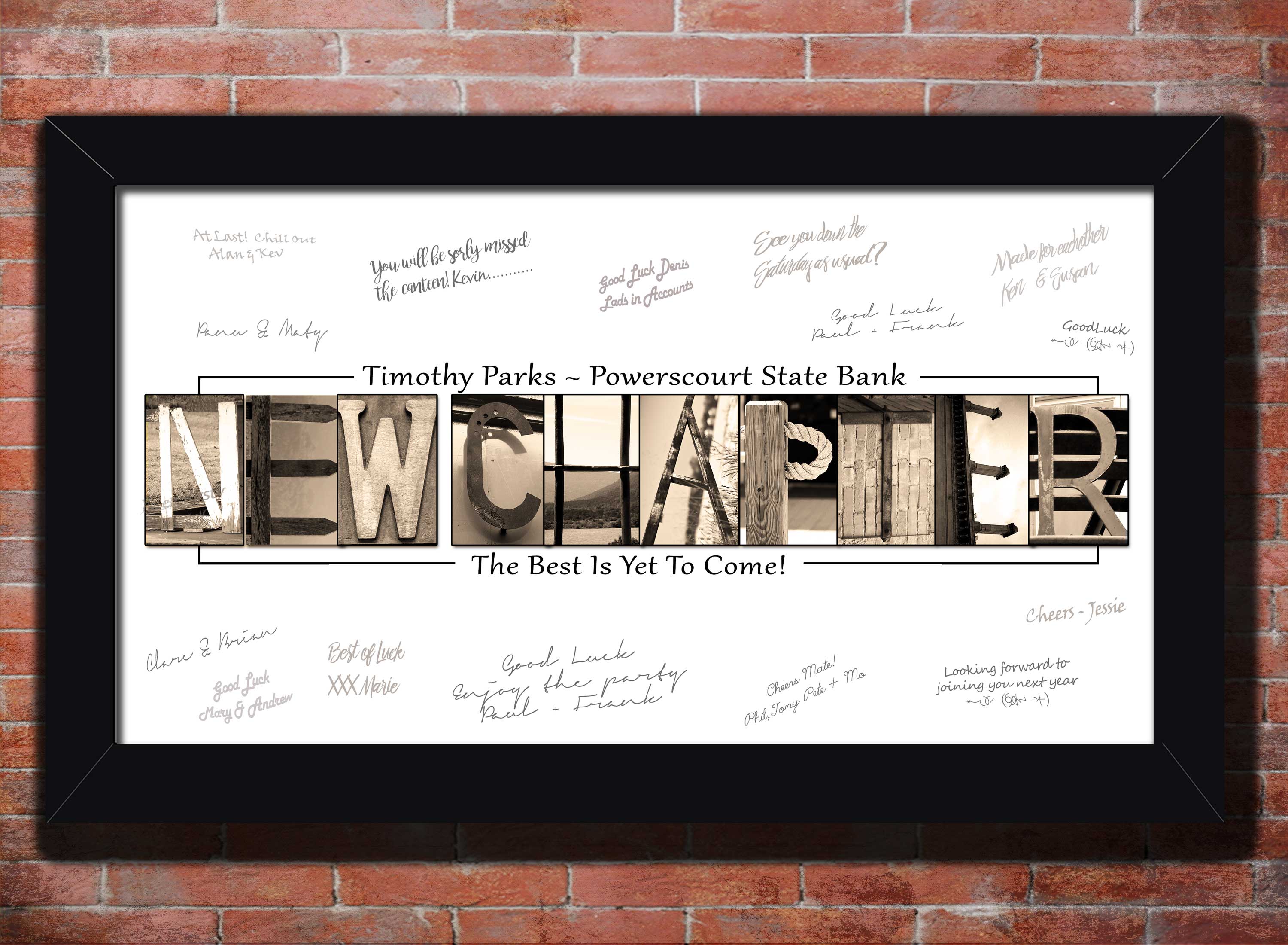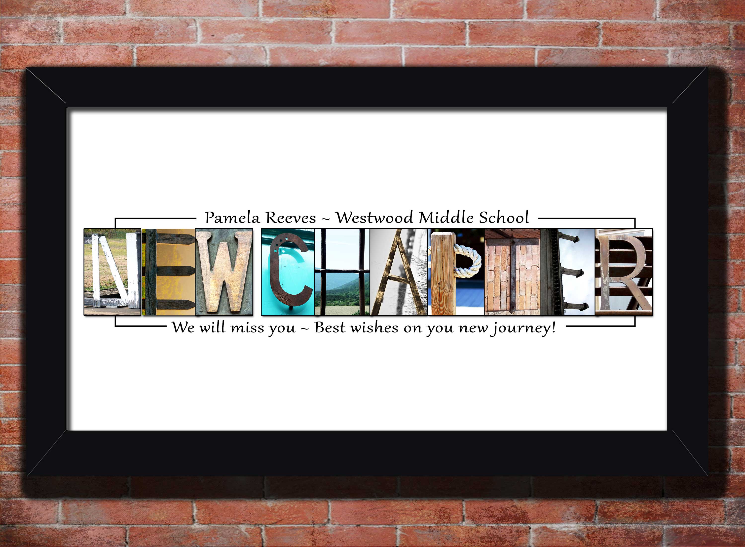 Using a unique blend of my alphabet art photos I have designed the words NEW CHAPTER. When ordering, tell me what name and custom text to add. When signed by friends or co-workers and framed it will makes a perfect farewell keepsake gift.