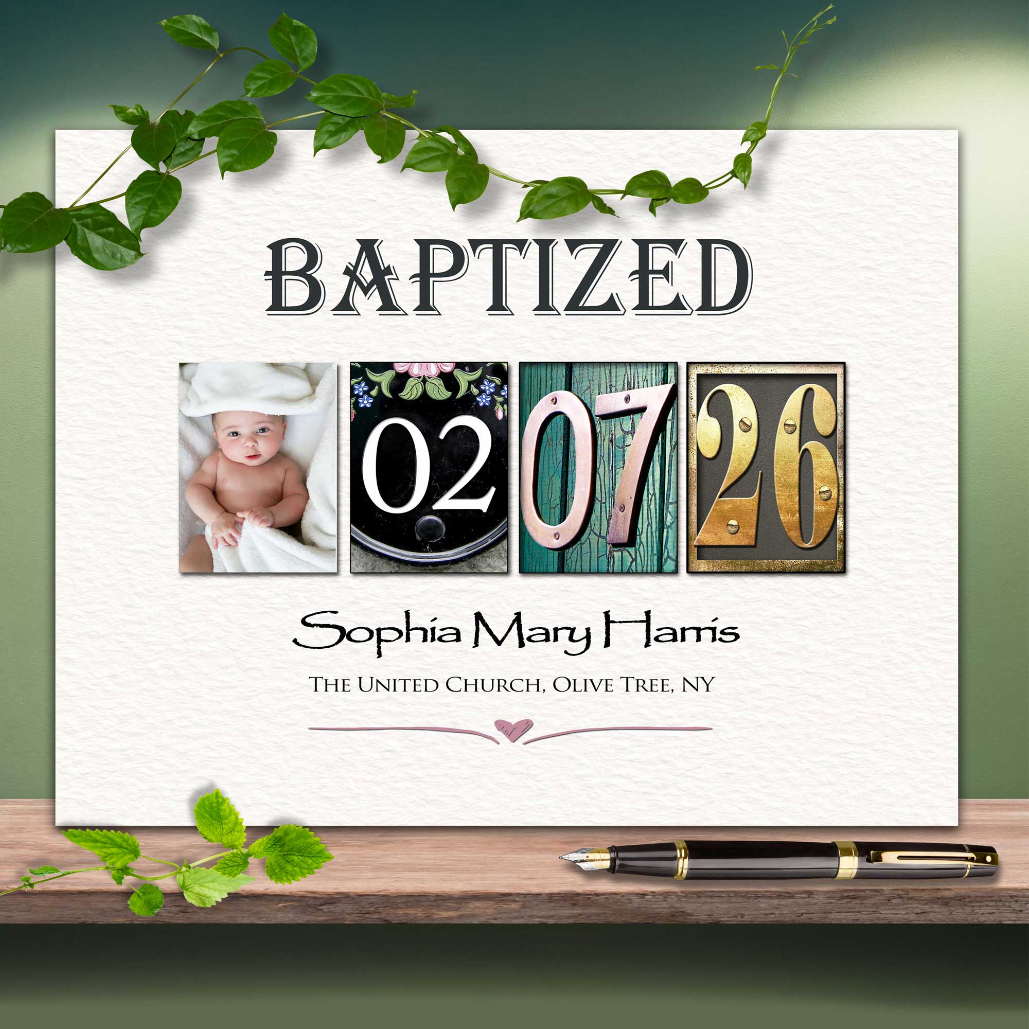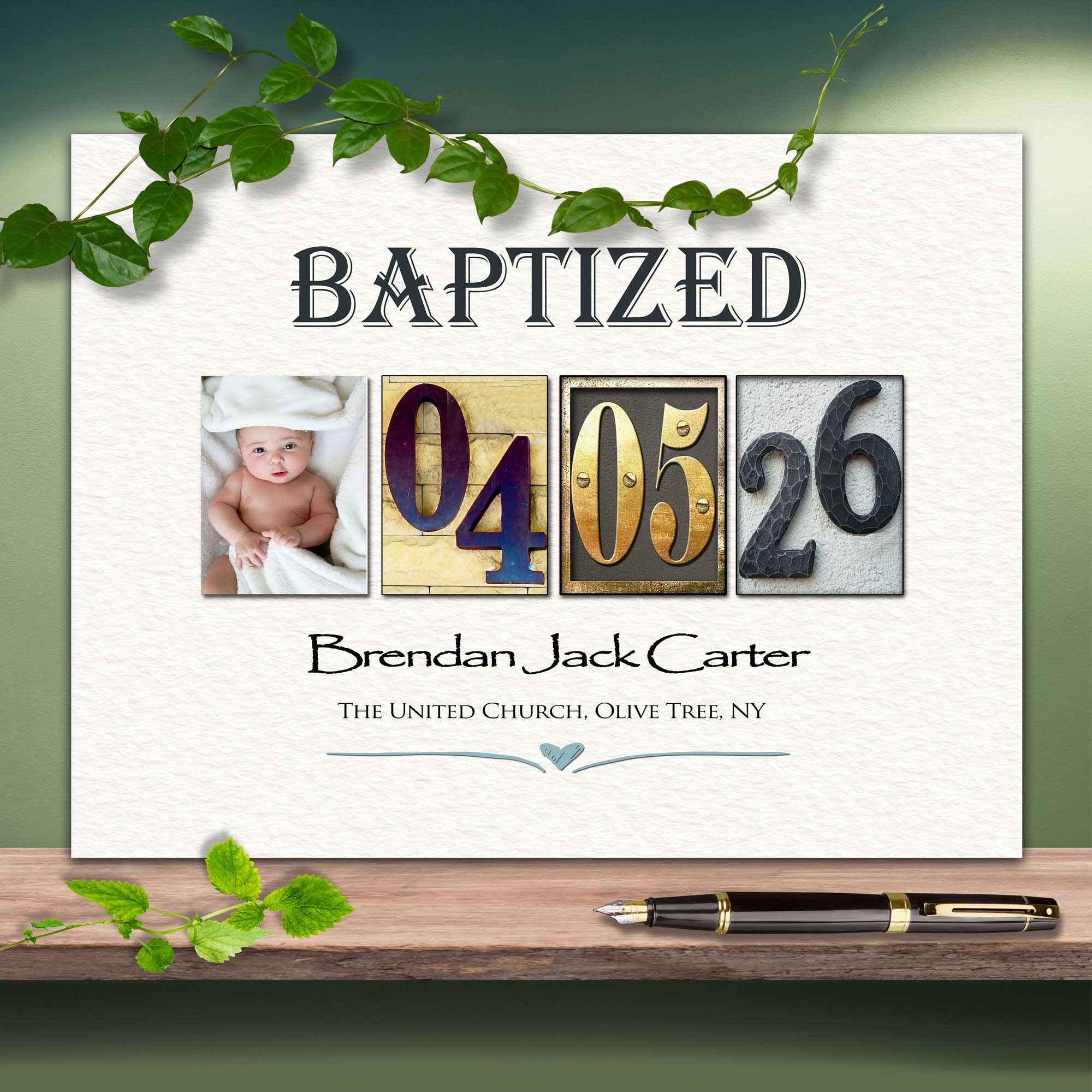 Using a unique blend of my Number Art photos I have designed the baptism DATE. Below this is child's FULL NAME and the CHURCH NAME and location. . When signed by all the family and friends and framed it will makes a perfect keepsake gift for BAPTISM.