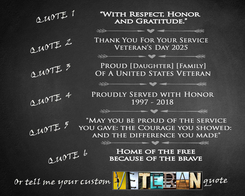 This listing is for the DIGITAL version of my VETERAN letter art image. You will receive one printable JPGs with your choice of text such as "With Respect, Honor and Gratitude" and customization of the veterans name and armed forces branch e.g. United States Army.