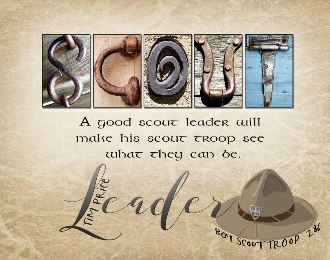 This listing is for the DIGITAL version of my SCOUT LEADER/MASTER letter art image. You will receive one printable JPGs SCOUT letter art image with your choice of quote (see below) and customization of the Scout Leaders name underneath and scout troop number in the bottom right corner.
