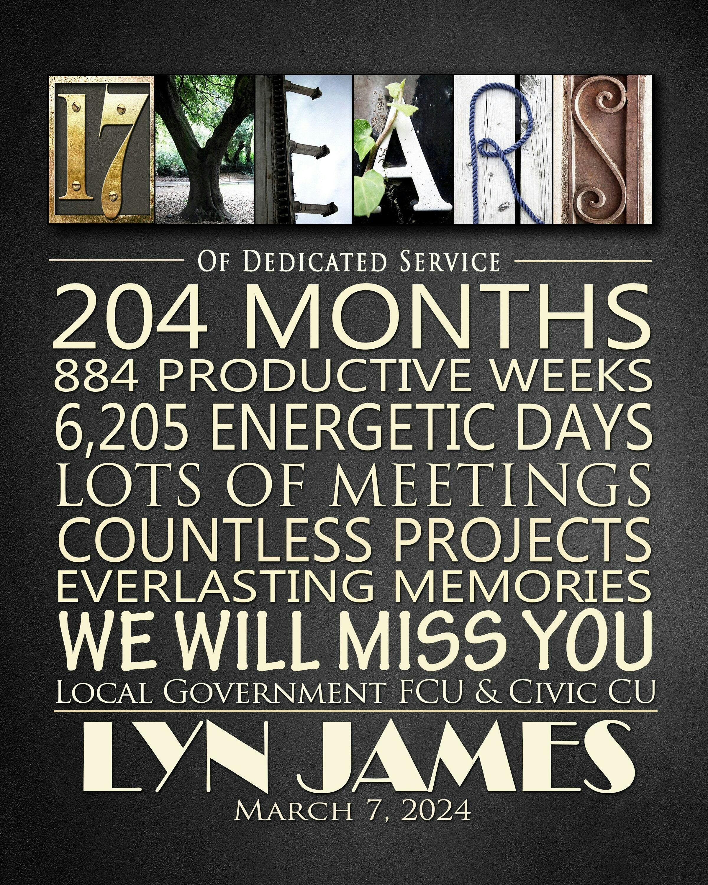 Using a unique blend of my alphabet art photos I have create the number of YEARS service e.g. 3 YEARS. When ordering the image tell me in the Personalization section the YEAR number, employee name and custom text you wish added.