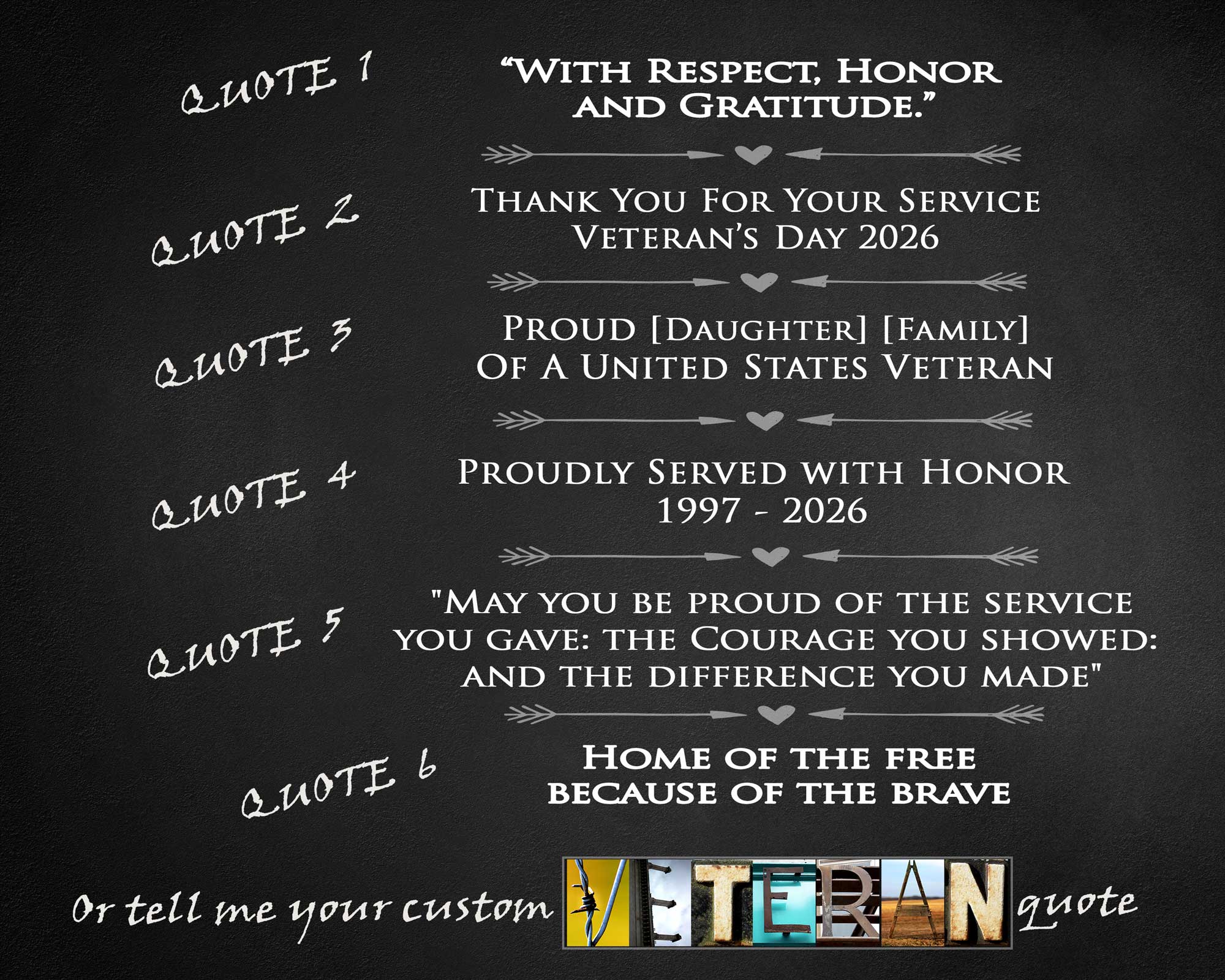 This listing is for my VETERAN letter art print. You will receive one high quality print with your choice of text such as "With Respect, Honor and Gratitude" and customization of the veterans name and armed forces branch e.g. United States Army.